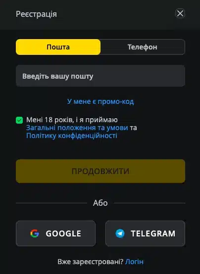 1.Якщо ви оберете реєстрацію через пошту, вам потрібно буде ввести свою електронну адресу в відповідне поле. Зверніть увагу на галочку, що підтверджує ваш вік та згоду з “Загальними положеннями та умовами” і “Політикою конфіденційності”. Це обов’язковий крок, адже казино дбає про відповідальну гру та дотримання законодавства. Після цього натискаєте “Продовжити”, і система надішле вам листа для підтвердження пошти.