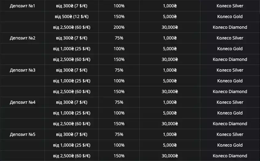 Залежно від суми поповнення, ви зможете отримати різний відсоток бонусу: від 75% до 200%. Наприклад, за перший депозит від 300₴ ви отримаєте 100% бонусу до 1 000₴ та обертання на Колесі Silver, а за 2 500₴ – 200% бонусу до 30 000₴ і обертання на Колесі Diamond. І це лише початок! Наступні чотири депозити також принесуть щедрі бонуси, тож ви матимете чудову можливість значно збільшити свій банкрол.