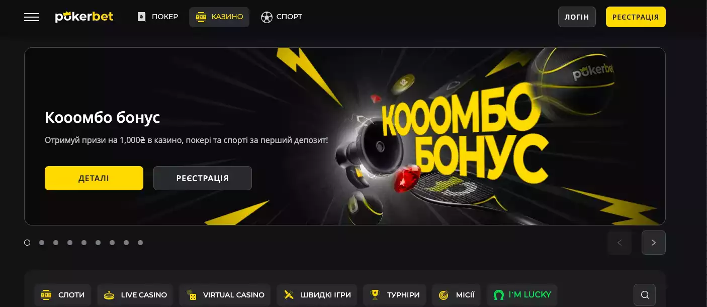 Pokerbet – онлайн-казино з широким вибором ігор, включаючи слоти, live-казино, швидкі ігри та турніри. Нові гравці можуть отримати щедрі бонуси на перші 5 депозитів до 150 000₴, а також обертання на Колесах Фортуни. Казино також підтримує мобільну версію, що дозволяє грати на будь-якому пристрої.